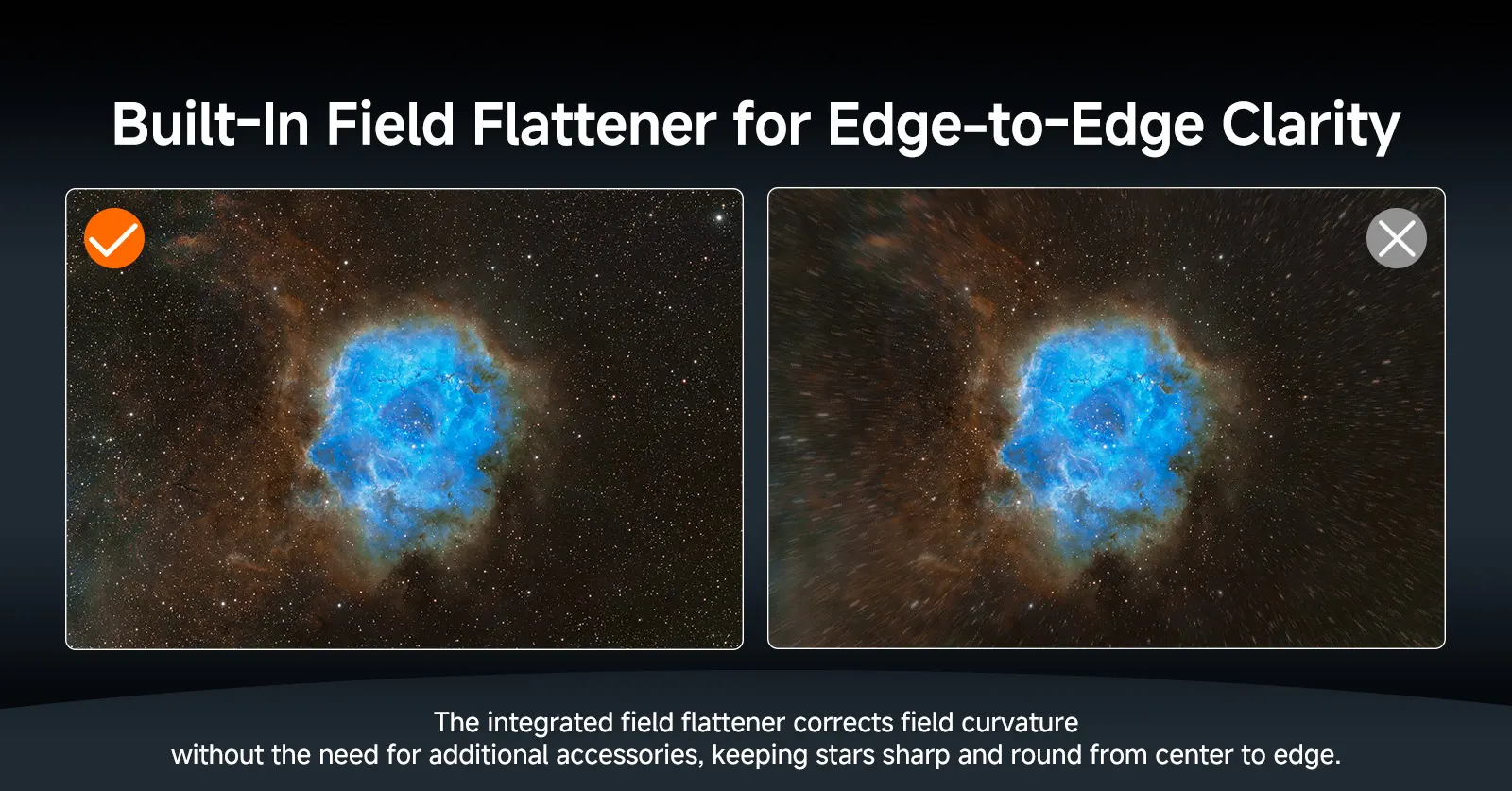 Dank des nativen Flatfield-Designs sind keine externen Korrektoren erforderlich. Das spart Kosten und Aufbauzeit und liefert sofort eine gleichmäßige Sternabbildung bis in die Bildecken. - Integrierter Fokus mit EAF-Vorbereitung