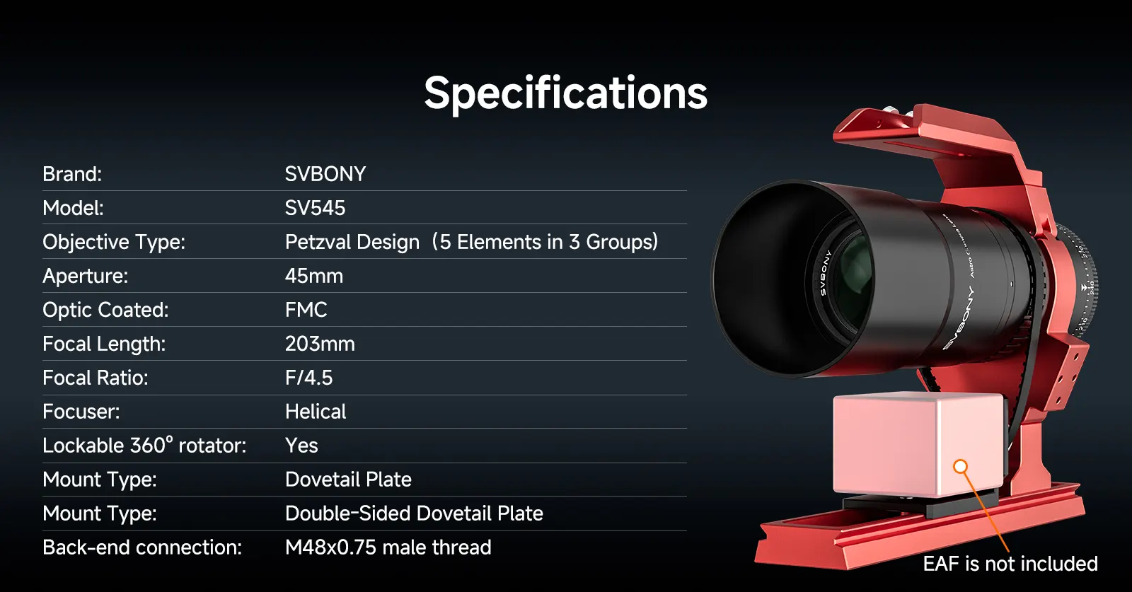 ![SVBONY SV545 [W9317B] Petzval-Refraktor 45/203mm f/4,5 (mit Gutschein: "545" Zehn Euro sparen) – Bild 4](https://svbony.eu/wp-content/uploads/2025/08/W9317B-5_20251219101113_3737.webp)