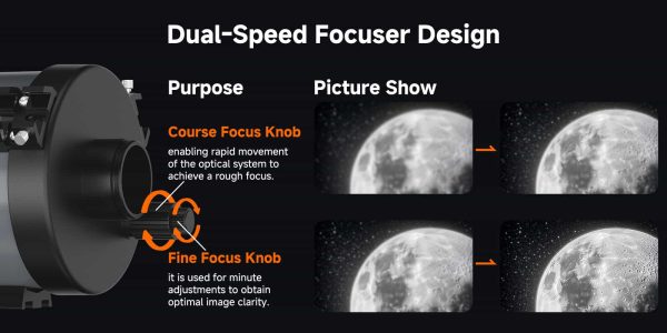 - Dual-Speed-Fokussierer-Design: Grobfokussierknopf ermöglicht eine schnelle Bewegung des optischen Systems für eine grobe Fokussierung; Feinfokussierknopf für präzise Anpassungen zur optimalen Bildschärfe und verbesserten Beobachtungserlebnissen.