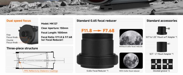 - Hochleistungsoptik: 127 mm Öffnung, 1500mm Brennweite (f/11.8) Maksutov-Cassegrain-Optik, Spiegelreflexion erreicht über 95 %; verbessert den Kontrast bei der Abbildung von Zielen, ermöglicht detaillierte Ansichten von planetarischen Nebeln und Kugelsternhaufen.