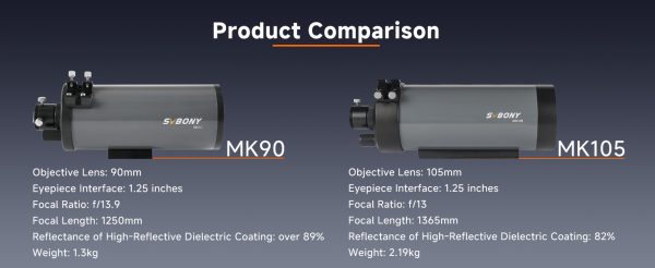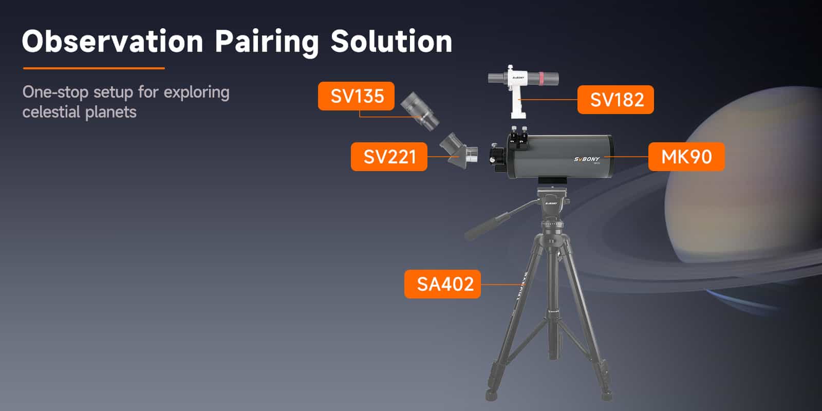 Maksutov-Cassegrain Teleskop-Innovation: Das SVBONY MK90 (90mm, 1250, Brennweite) verfügt über eine konvexe Meniskuslinse anstelle einer herkömmlichen Schmidt-Korrekturplatte, wodurch der Kontrast verbessert und die Notwendigkeit einer regelmäßigen Kollimation eliminiert wird.